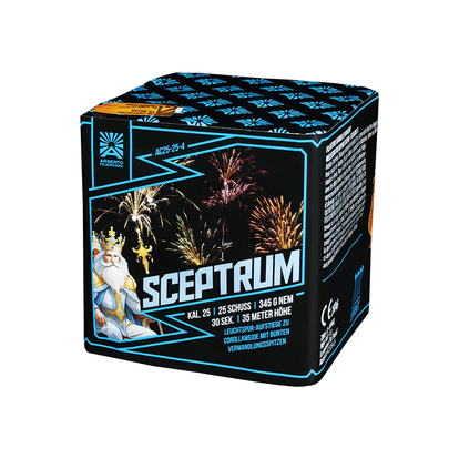 Argento Sceptrum ist eine 25 Schuss Feuerwerksbatterie im Kaliber 25mm. Sceptrum bietet Leuchtspur-Aufstiege zu Corolla-Weiden mit Verwandlung zu Farbspitzen in rot, gelb, grün, blau und violett. Argento Sceptrum muss man einfach haben! Top Qualität zum tollen Preis.