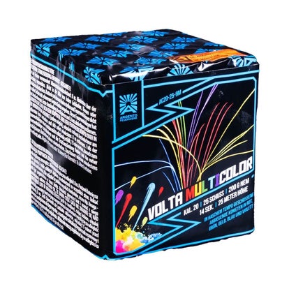 Die Argento AC20-25-3 Goldmarie zeigt blaue Leuchtkometen-Aufstiege mit lautstarker Verwandlung zu Brokatkronen, nacheinander kombiniert mit blutroten Sternen, weißen Blinksternen, blauen Sternen, roten Blinksternen und Silbercrackern. Die AC20-25-3 Goldmarie von Argento hat zwar nur Kaliber 20 mm, aber die Buketts können locker mit 25 mm Effekten anderer Hersteller mithalten. Argento Goldmarie bietet sehr schöne Feuerwerkseffekte zum kleinen Preis. Tipp!