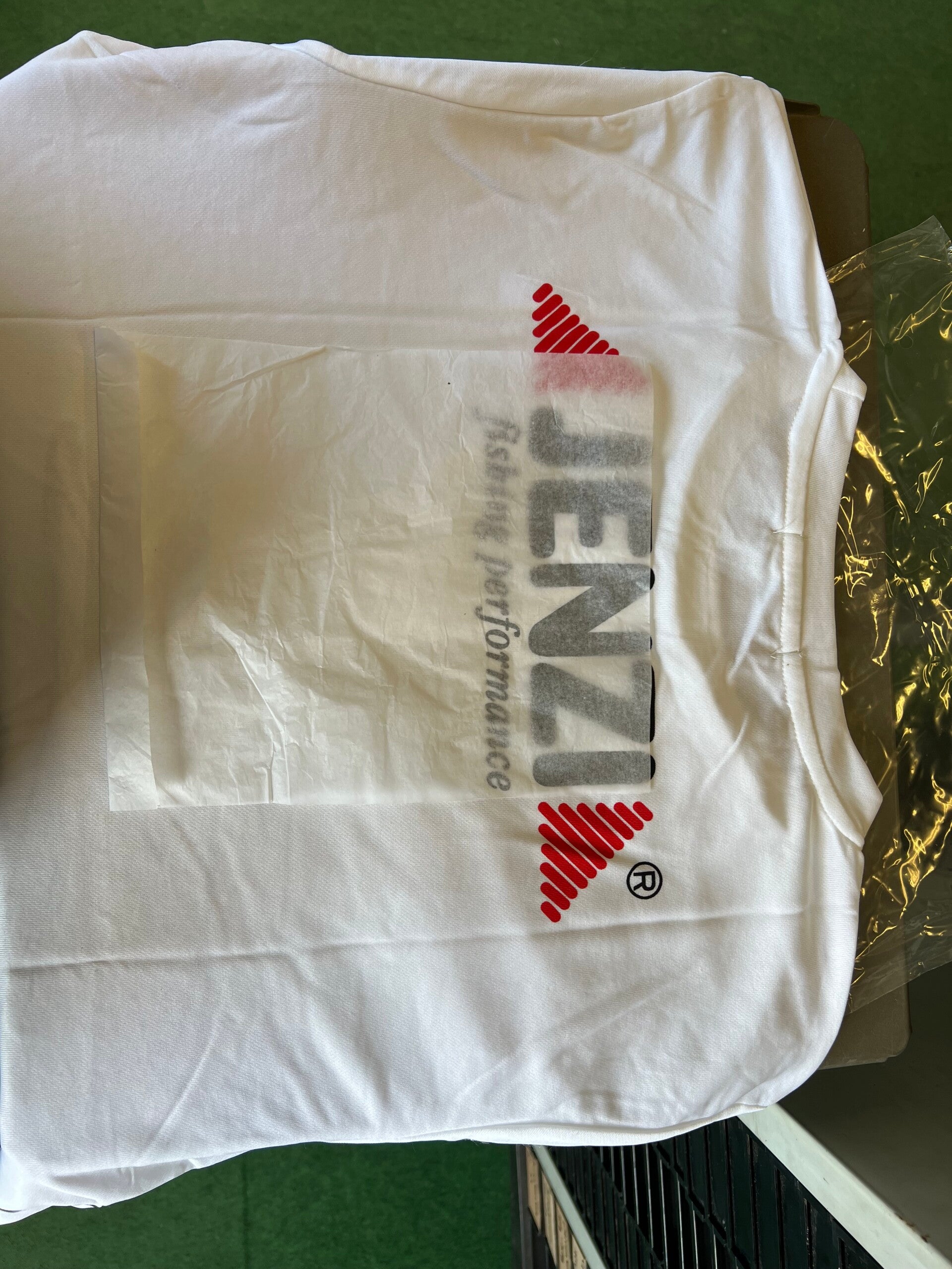 Zum Verkauf stehen T-Shirts von der Marke Jenzi in der Farbe weiß mit einem Aufdruck