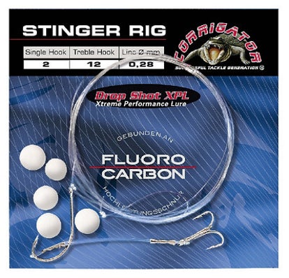 STINGER RIG Gebunden an japanischem FLUORO-CARBON Das fertige DROP SHOT Vorfach; nur noch Köder und Blei montieren und es kann losgehen. Mit der sogenannten ,Angsthakenmontage" wird bei größeren Ködern die Fehlbissquote sowie Aussteigerrate minimiert
